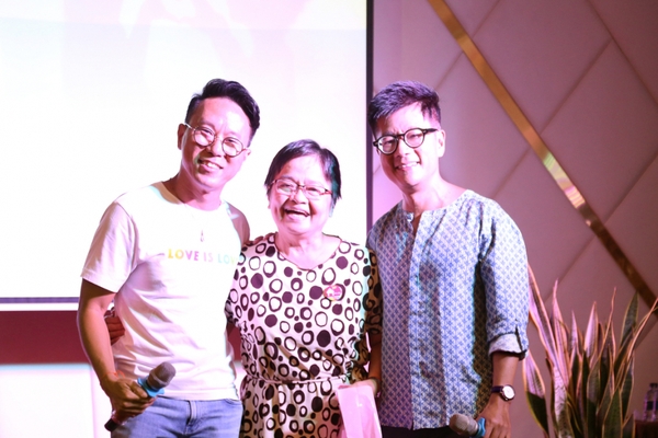 | Anh và Cưng (trái) cùng mẹ Nguyễn Thủy (thành viên Hội PFLAG Sài Gòn) tại lễ hội cặp đôi |